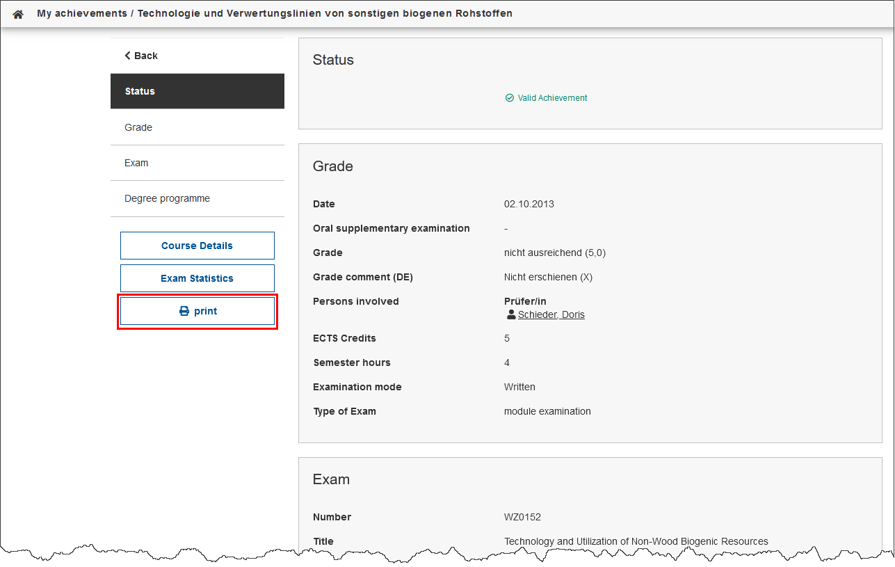 Here you can see the persons involved, the number of ECTS credits obtained for the achievement as well as information on the degree program.