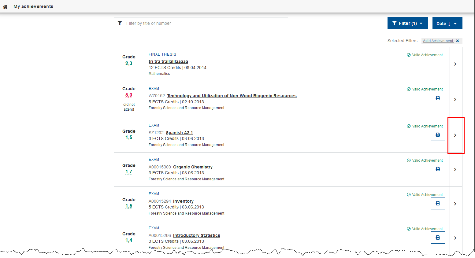 In the application “My Achievements”, click on the arrow next to a valid achievement on the right in order to open the detail view.