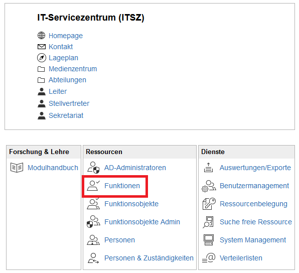 Melden Sie sich in TUMonline an und besuchen Sie die Visitenkarte der betreffenden Einrichtung, hier im Beispiel das IT-Servicezentrum. Klicken Sie dort im Applikationenmenü auf den Link "Funktionen":