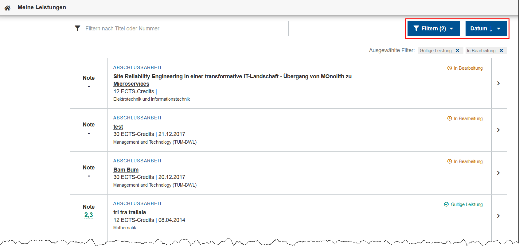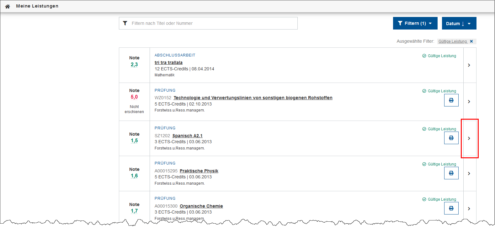 Standardmäßig ist die Liste absteigend nach Datum sortiert und – bei mehreren Studien – unabhängig vom Studium, für das Sie die Leistung erbracht haben.