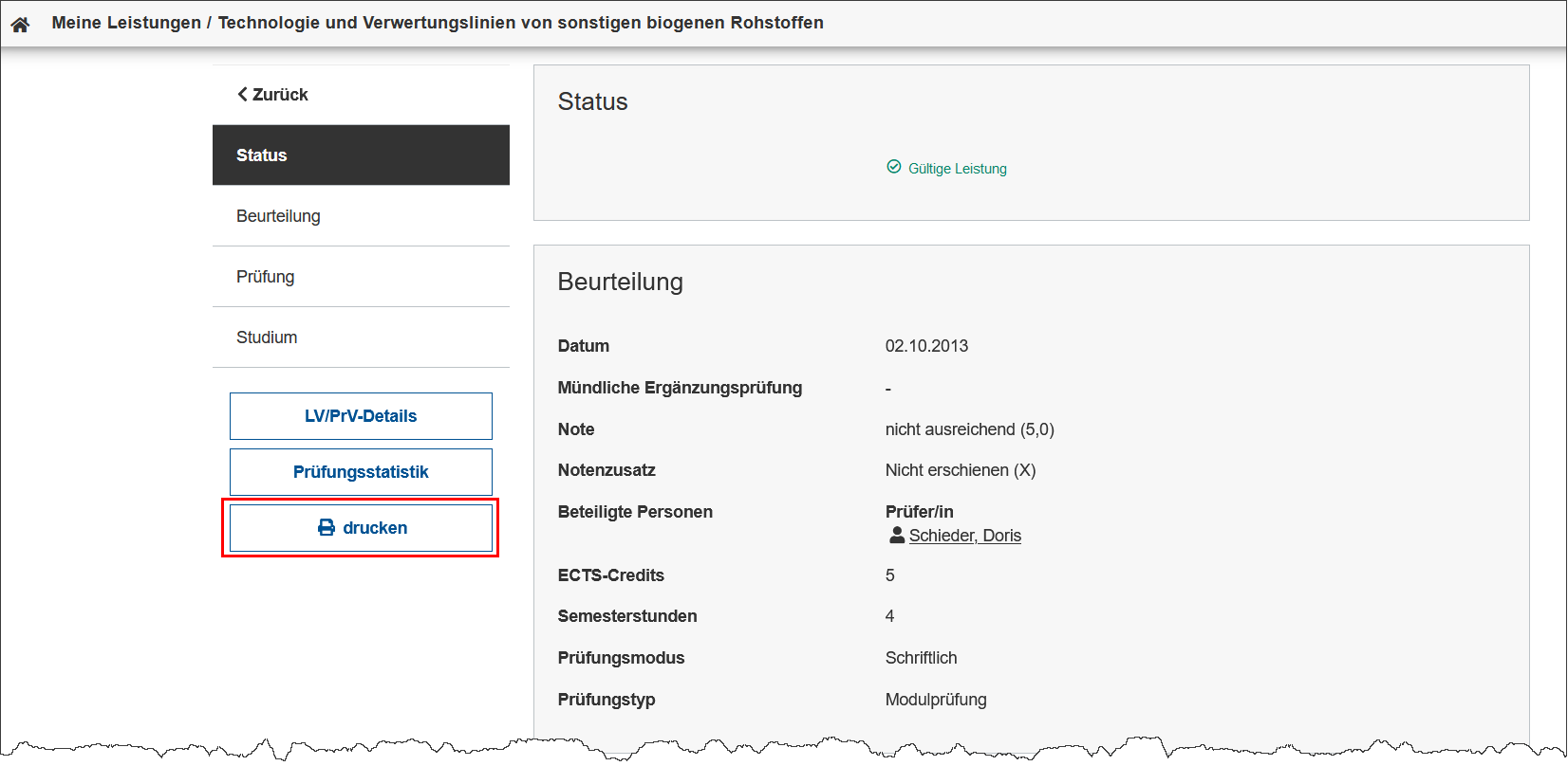 Status | Information zur Note | Einzelleistungsnachweis ausdruckbar |
