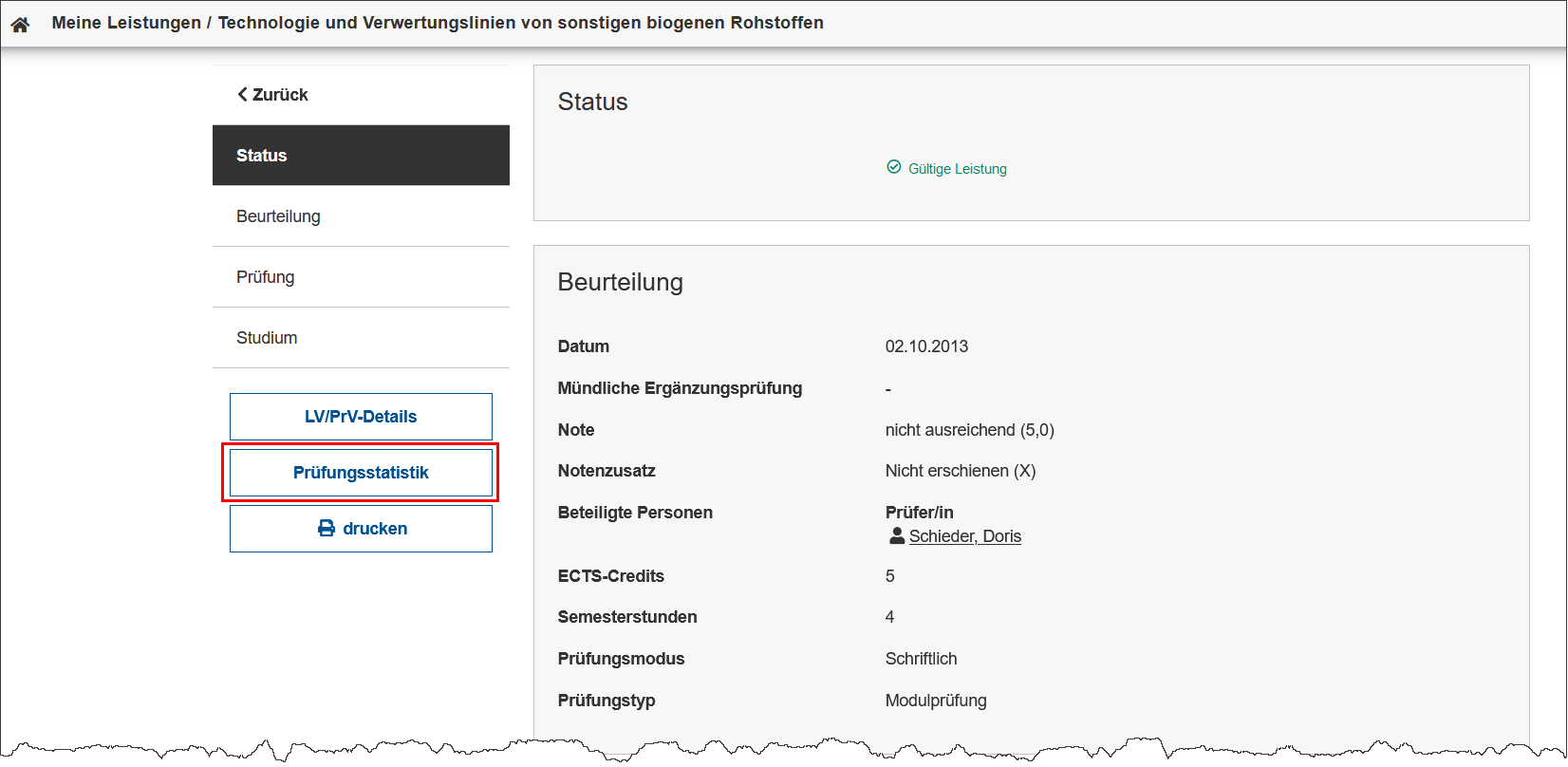 Screenshot: Prüfungsstatistik einsehen