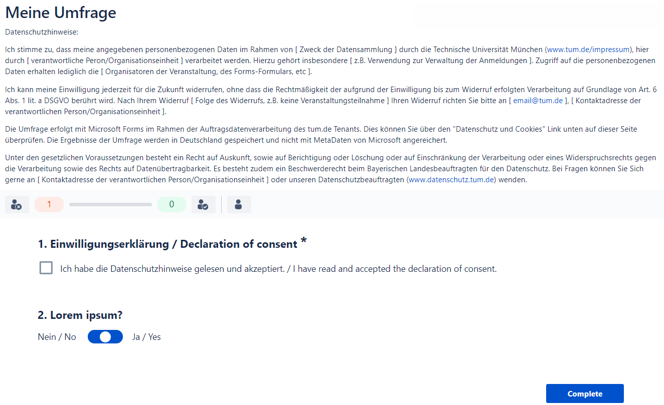 Der Datenschutzhinweis sollte am Anfang (Formular | Umfrage | Voting) eingefügt werden. Ein Beispielformular | eine Beispielumfrage | finden Sie hier.