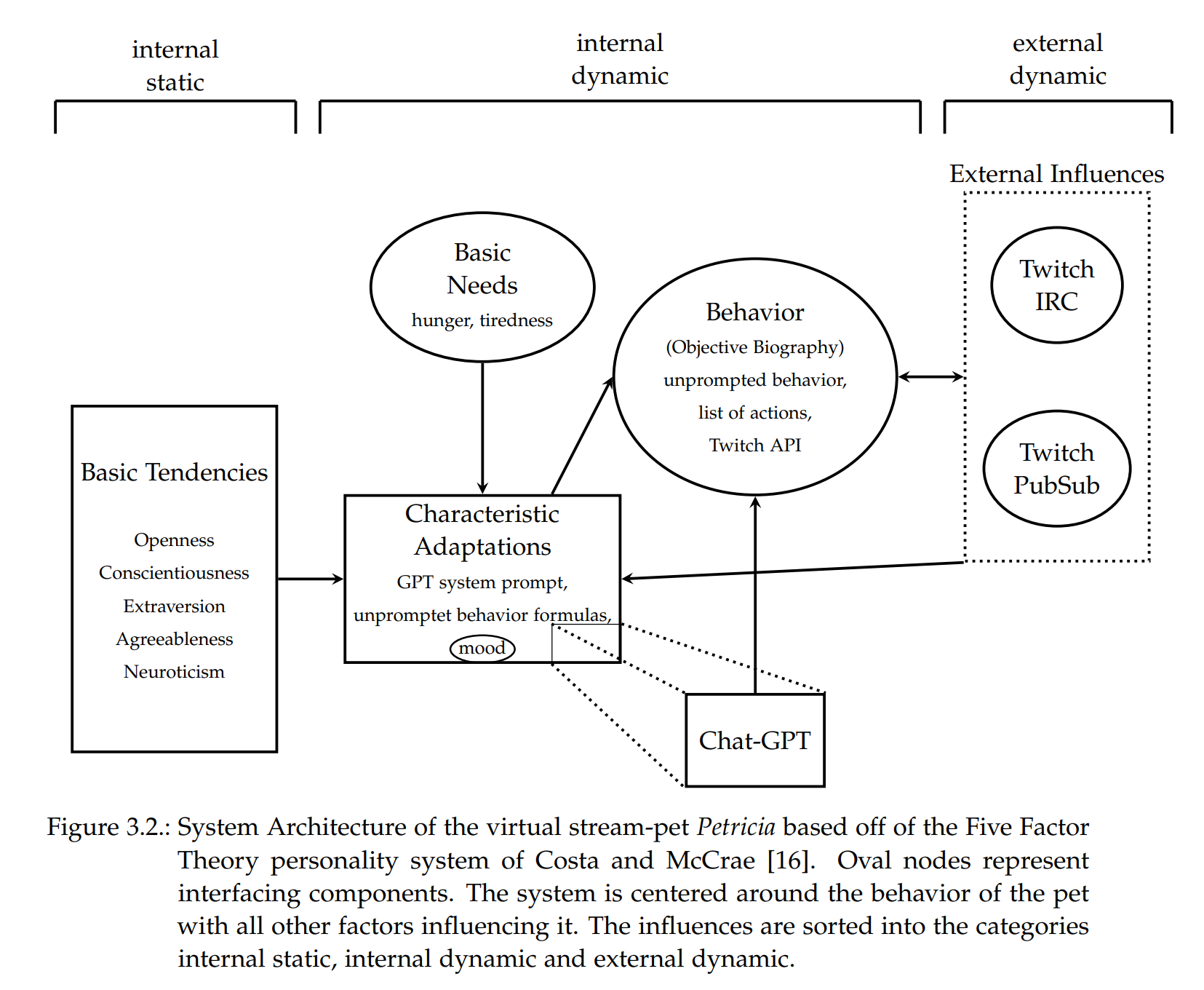 The goal in designing Petricia was to create additional entertainment for live-streams while trying to keep the distraction from the stream’s own content as low as possible. She is visually designed to look like a small cat- and dog-like creature with large ears, as seen above. The pet should function as an assistant for the streamer with a large focus on its natural integration into the stream’s flow. To achieve the most natural behavior, Petricia’s reactions are chosen by a text-based artificial intelligence, namely ChatGPT. This way the pet is able to use Natural Language Processing (NLP) and can therefore understand the natural speech, different languages and even slang used in the stream’s chat.