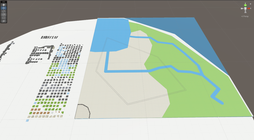 Final iteration: Water for even clearer area distinction, reduced asset variety, moved things closer together to decrease size further