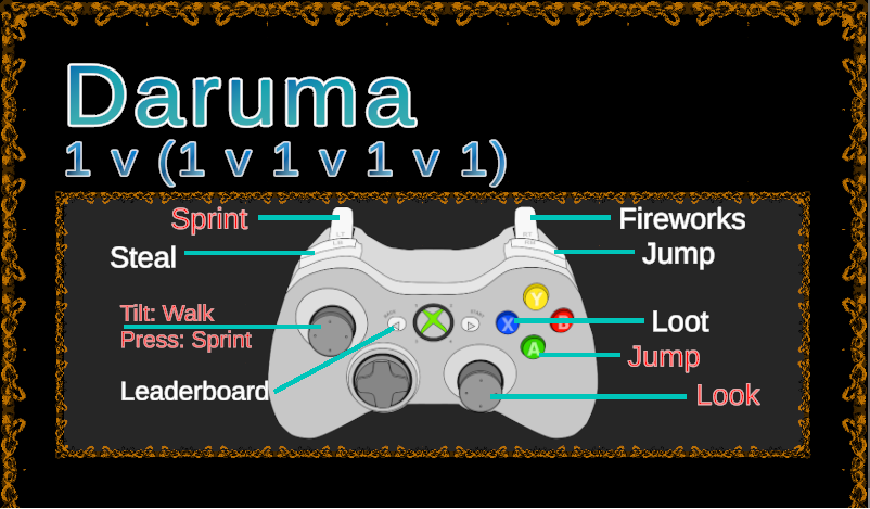 Daruma is an asynchronous multiplayer game. The game was made with a focus on level design with the theme "taking cover". There is one seeker who can look at the whole map from above, but only through a small view cone. The seeker needs to find the runners, the other type of player. The runners explore the map, gather coins, take cover, and try to bring their coins to the seeker-castle in the middle of the map to save them permanently. Runners can also steal coins from other runners or expose their positions by shooting fireworks. In the end, the player with the most gained coins wins. It should be added that the seeker gets his coins by clicking on a runner and steeling the currently carried coins from the discovered runner.