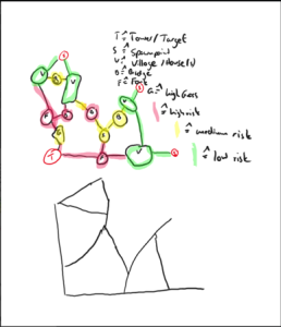 - High Risk/High Reward vs. Low Risk/Low Reward - In our game, the smaller side areas are very risky, but also offer a lot of loot. This made the game way more dynamic, since it now supports multiple different playstyles. One can just gather a few coins and immediately stash them in the seeker castle, or one can take the tangential long route, but be rewarded with way more coins. Both playstyles seem pretty balanced and viable.