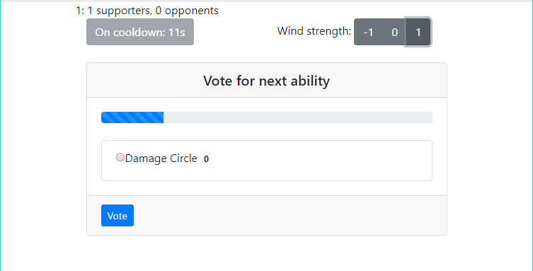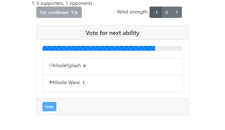 From time to time, there are polls which ask all supporters of the opponents to vote for the next special boss or boss wave ability. They can either decide on a missile wave that punishes the player with removing a huge amount of health points, if the player stays in that area at the right moment, or a missile splash that hit three locations at the players location in a short amount of time. There is also another poll which asks all of the supporters to vote for the next boss wave; they can decide on the location where they should spawn.