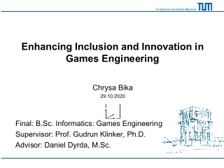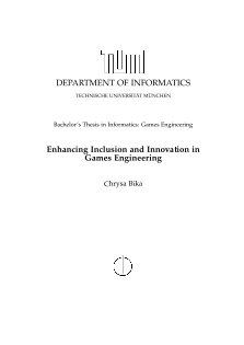The main purpose of this bachelor ’s thesis is to develop methods and solution-oriented approaches, which will enhance inclusion and innovation in games engineering. To achieve this goal, the methodology of a thorough literature review was utilized. Much attention has been given to the state-of-the-art of games engineering, interaction of game development teams and the correlation between teams and their published video games. Numerous studies have shown the need to develop diverse games with female protagonists, as the female population that enjoys playing video games is constantly increasing. Moreover, the group of people with disabilities still face several issues when attempting to play video games. For an inclusive game experience, more accessibility features and accessible devices should be implemented. Furthermore, two practical projects were developed in this thesis. With the first project, exercises and potential lecture slides for a games engineering curriculum were generated. Here students can, for instance, learn what it means to have an impairment and which accessibility features can be implemented to enable playing games. The second project is an interview with an expert from a famous video game company with studios across the world. The interviewee evaluated the introduced methods and gave insights into the work of a games company. Keywords: games engineering, software engineering, inclusion, innovation, diversity, accessibility, discrimination, education