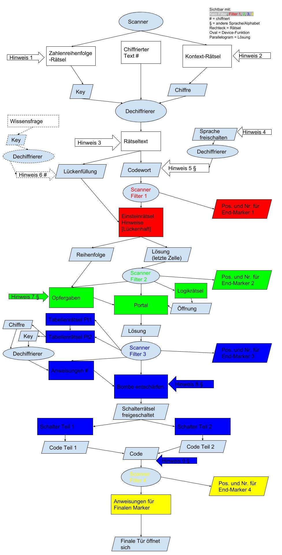 A comprehensible overview of the Escpae Room's structure can be seen in the flowchart we used. The coloured elements represent the filters needed to view these parts of the room.