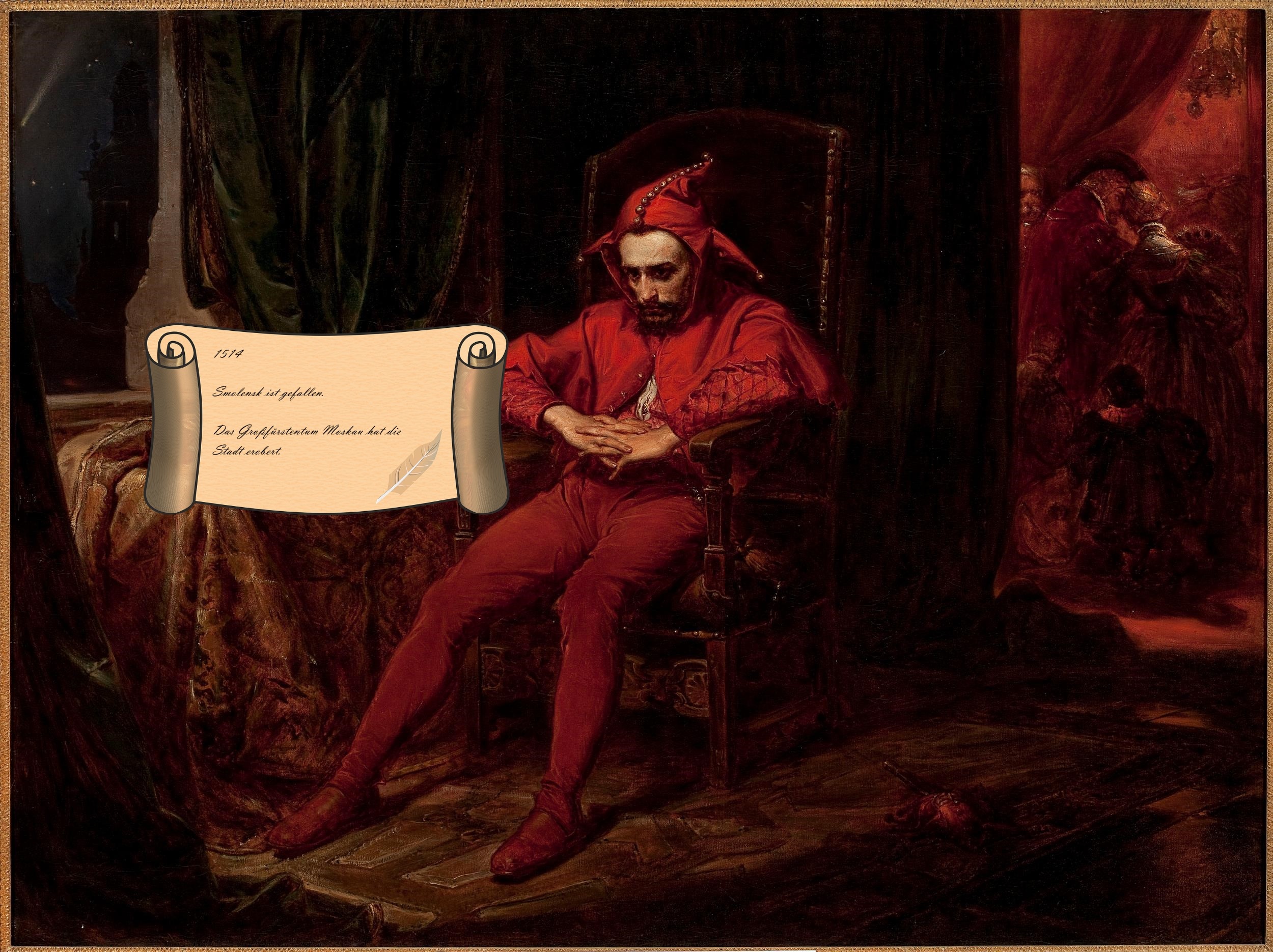 Furthermore, we implemented another bonus level where the players are able to use Augmented Reality to find additional information in a painting. Information that might otherwise only have been found by searching for additional historical context on the internet. In our example we took Jan Matejko's painting called "Stanczyk". Without knowing the historical context, the observers might not be aware why the Jester looks so sad in that painting, but with our implementation one can use a mobile device to scan the image for interesting points in AR, which will present the relevant knowledge in a more interactive way. All in all, our goal was to create a total experience that on one hand is capable of delivering an interesting narrative that explains the context of these paintings, but on the other hand, is able to take the players on an immersive journey to augment their interaction with art.
