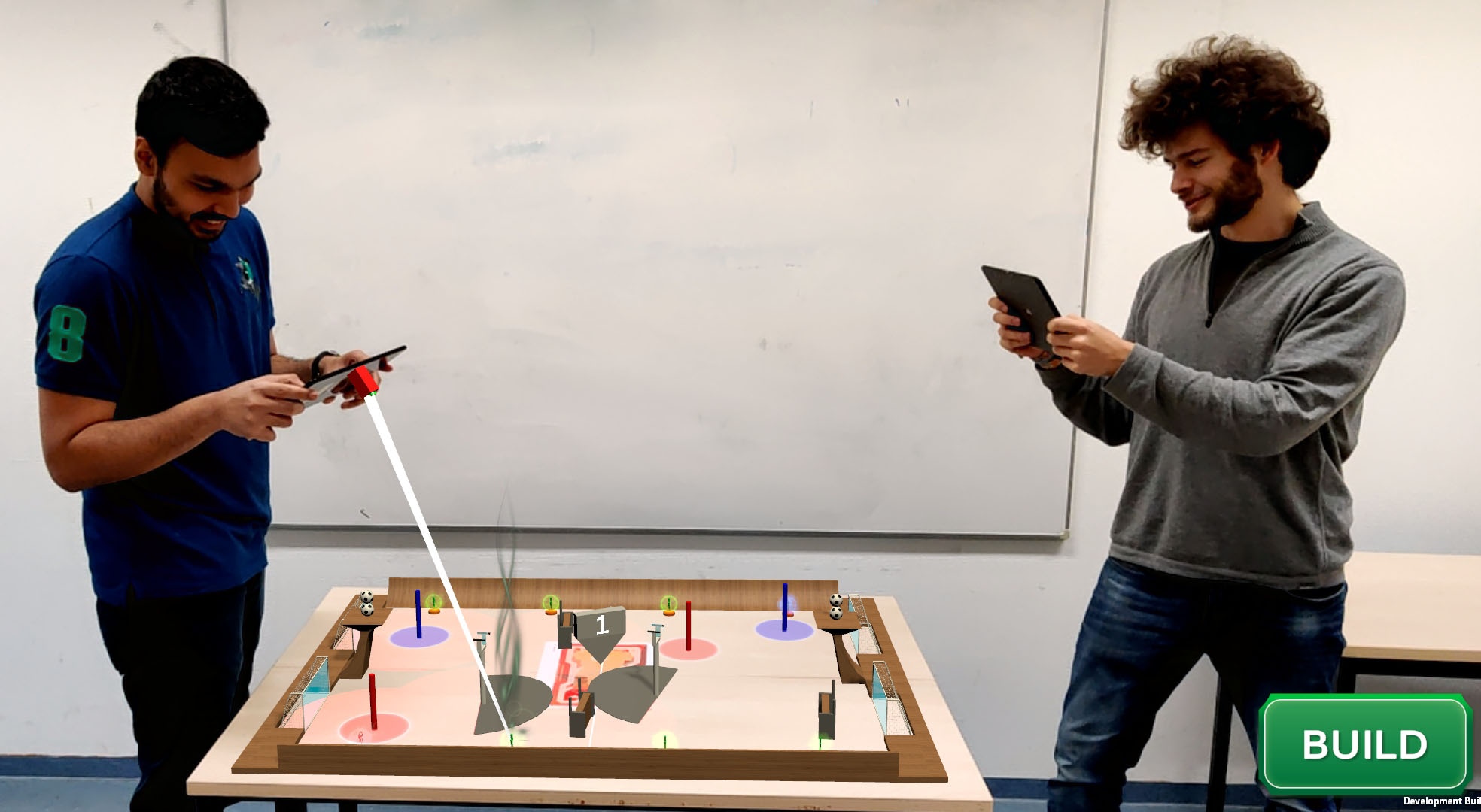 After the game has been set up, each player is responsible for two separate goal posts on their side. A certain number of balls spawn in front of them based on the specifications set before the game. The main objective of the game is to shoot these balls into the opponent’s goal post to score points. The players can shoot the balls by touching them on their device screen. The direction and power of the shot will depend on the angle and distance of the device from the ball. The closer the player’s device is to the ball, the faster the shot will be. This encourages players to physically move around the table in order to take proper aim and shoot balls with more force.