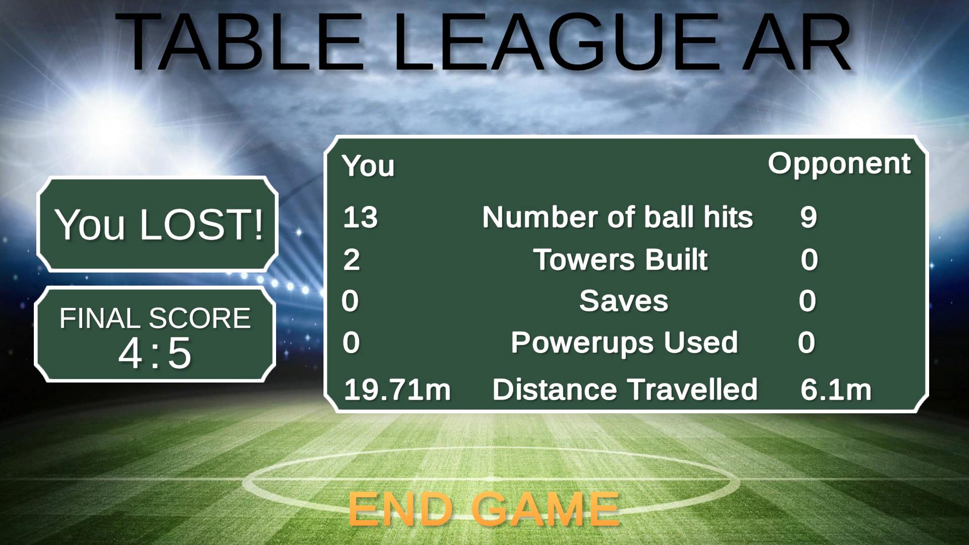 At the beginning of the game the player specifies the duration of the match (3, 5 or 8 minutes). When this time runs out, the match ends. After the end of the match the players can see the end game menu, where the result of the match is shown. Similar to a typical football game, the players scoring the most goal wins. Draws are possible. The end game menu also provides the players with some in-game statistics about both players. This includes the number of times the ball was hit, number of towers built, number of powerups used, distance travelled by the player and also the number of saves. Whenever a player is able to save a sure goal scoring opportunity of the opponent it is counted as a save. When the players are done reviewing the end game screen they can return back to main menu by pressing the ‘END GAME’ button.
