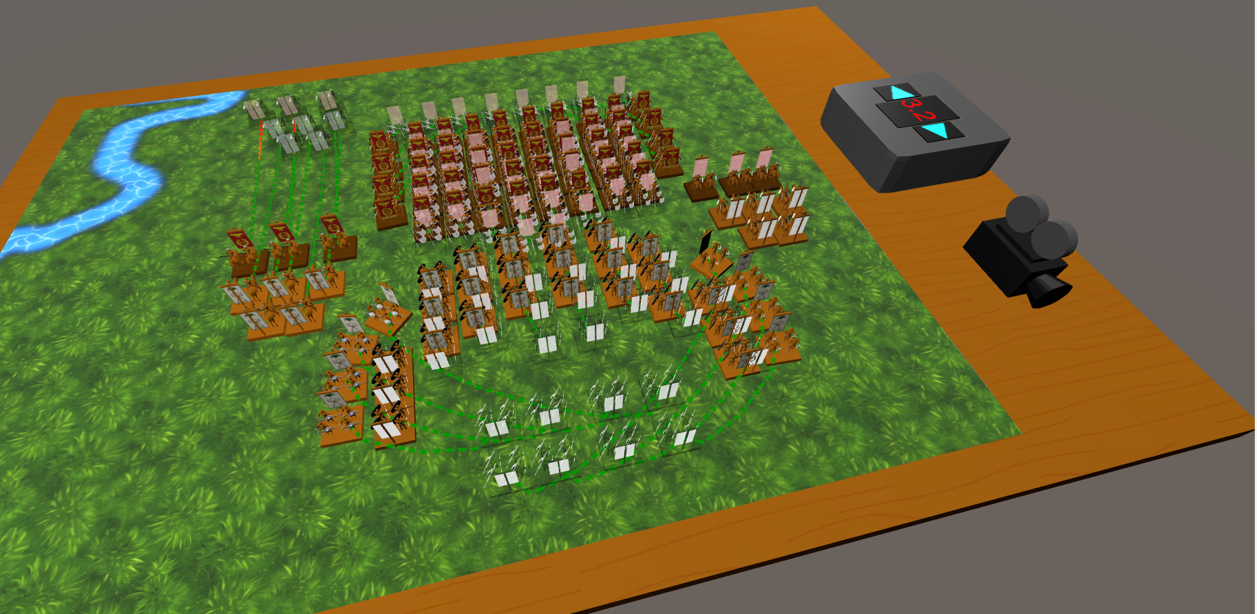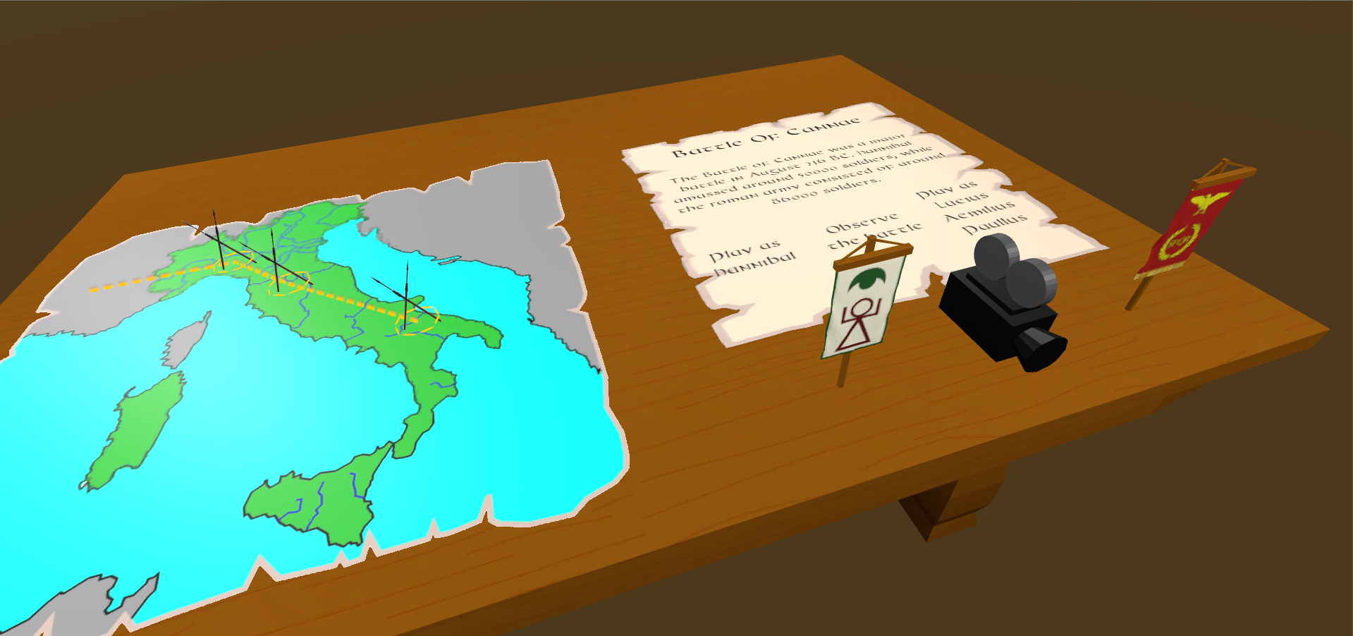 During my master thesis, I developed a Serious Game about Ancient Battles for a Virtual Reality headset. The goal of the game is to teach the player about the tactic which was used by Hannibal in the Battle of Cannae. The game features two modes. The first one is the battle simulation mode where you can play as one of the commanders of the battle versus the Artificial Intelligence. The second one is the replay mode where you can watch the historic steps of the battle.