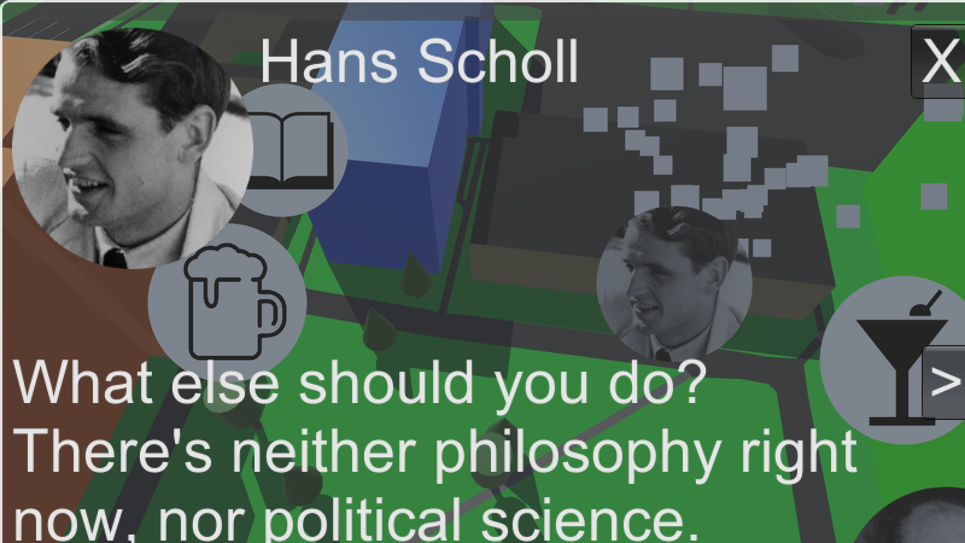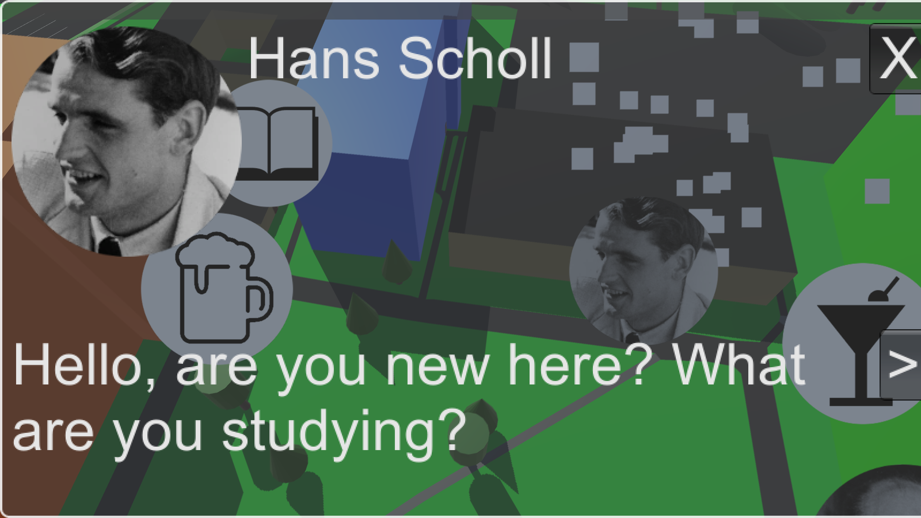 In the game the ghost of the namesakes come alive and express phrases consisting of translations of original quotes. For example, Hans Scholl talks to the player and says: "Hello, are you new here? What are you studying? I’ve never really known, why I study medicine. What else should you do? There’s neither philosophy right now, nor political science. Freedom, both in choosing a career and a course of study, was my highest principle." Players gain two insights, firstly that Hans Scholl studied medicine and secondly, that he struggled to find a course of study and they might relate to their own life. Hence, these quotes make it easier for students to identify with the namesakes and learn in context.