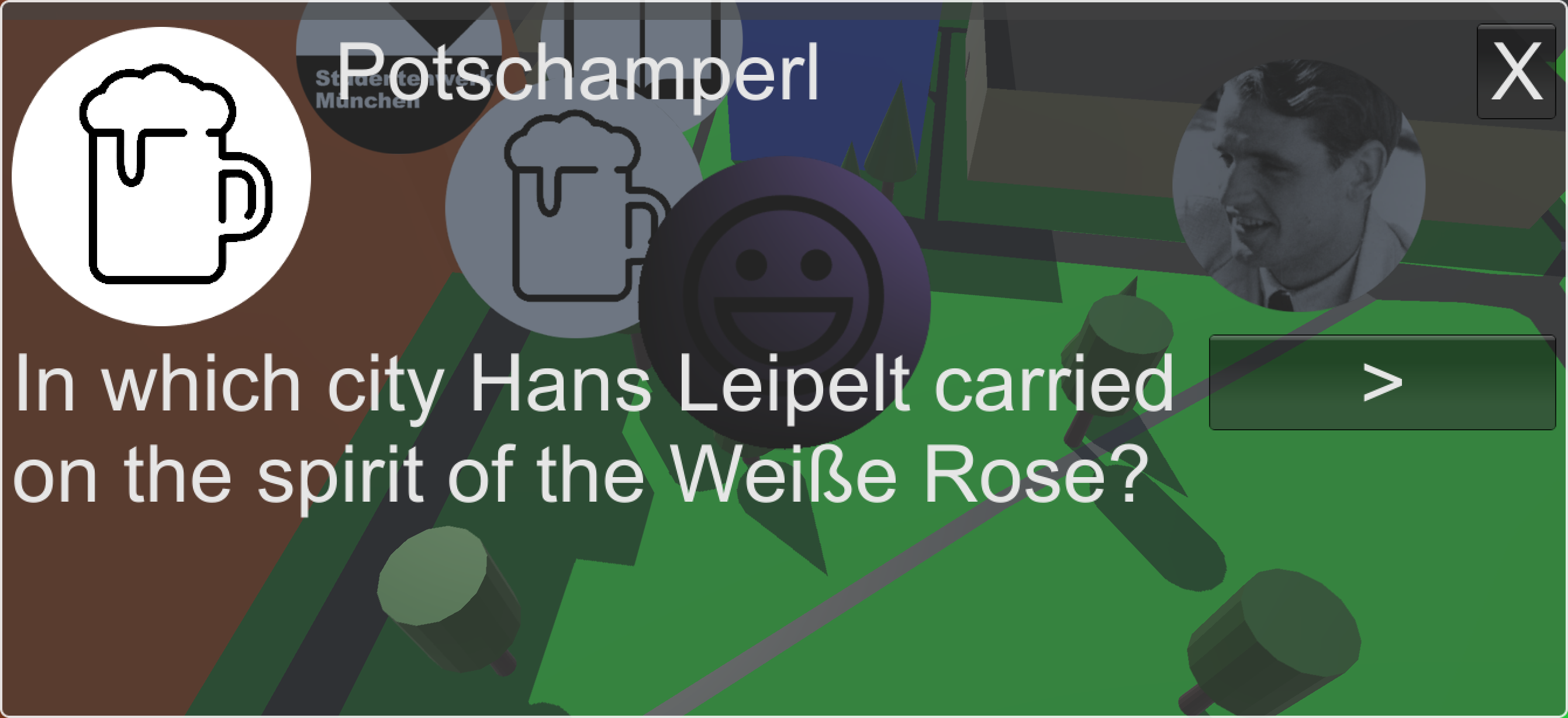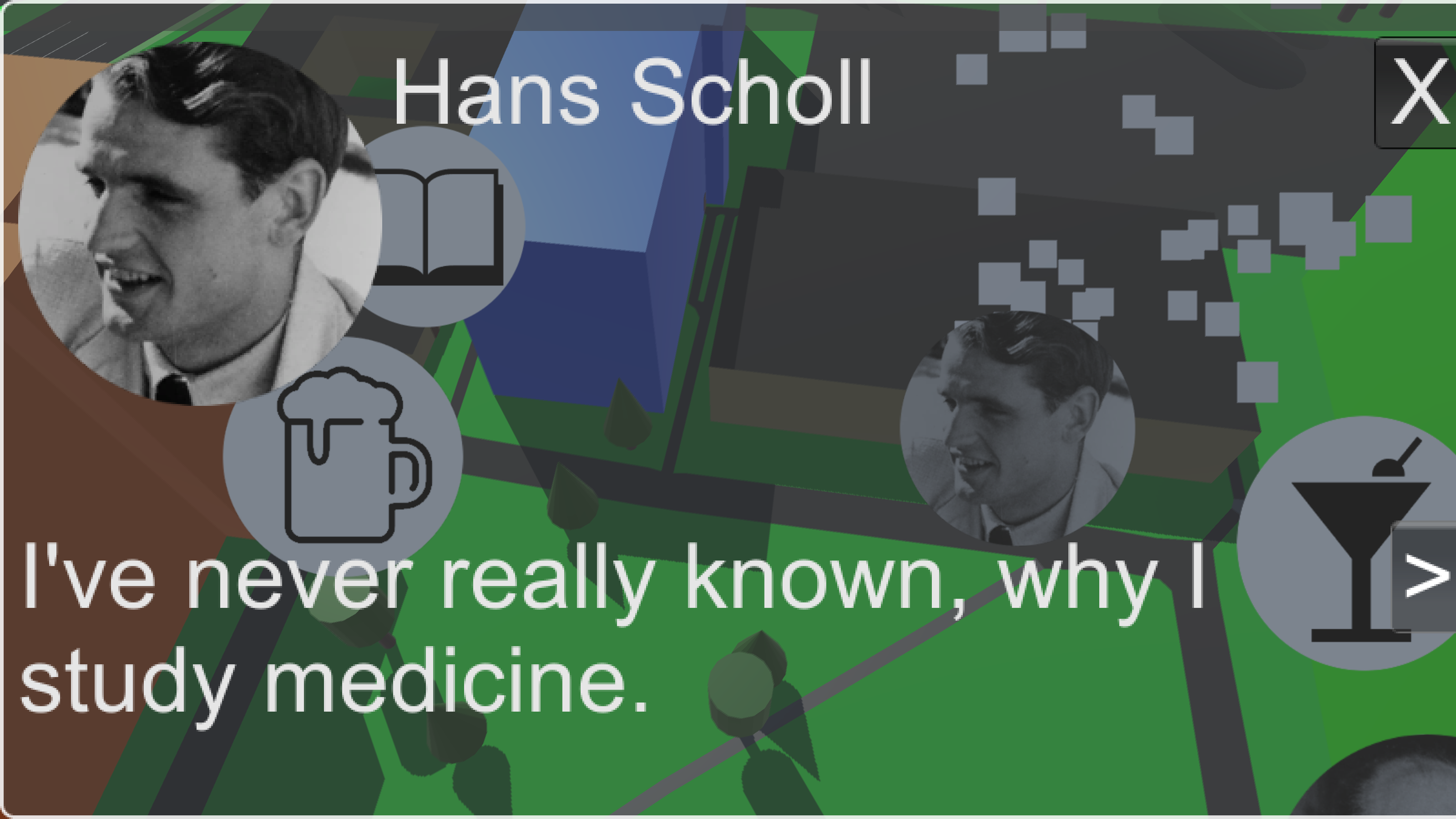 There have been several efforts to make the legacy of the Weiße Rose visible in Studentenstadt, but Students are unaware of the available information. For example, under each street sign there is a small biographical description. However, their size is insufficient to convey the essential information about the life of the members of the Weiße Rose. For example, the sign under the Willi-Graf-Straße reads: "Willi Graf, born 1918, member of the student resistance group ’Weiße Rose’, which made a plea for the resistance against the national-socialist dictatorship with several leaflets." This sign cannot capture Willi Graf’s person, for example, serving as medic in the war, or his strong connection to religion. The game is a modern answer to the question, how one would commemorate the legacy of the Weiße Rose today.