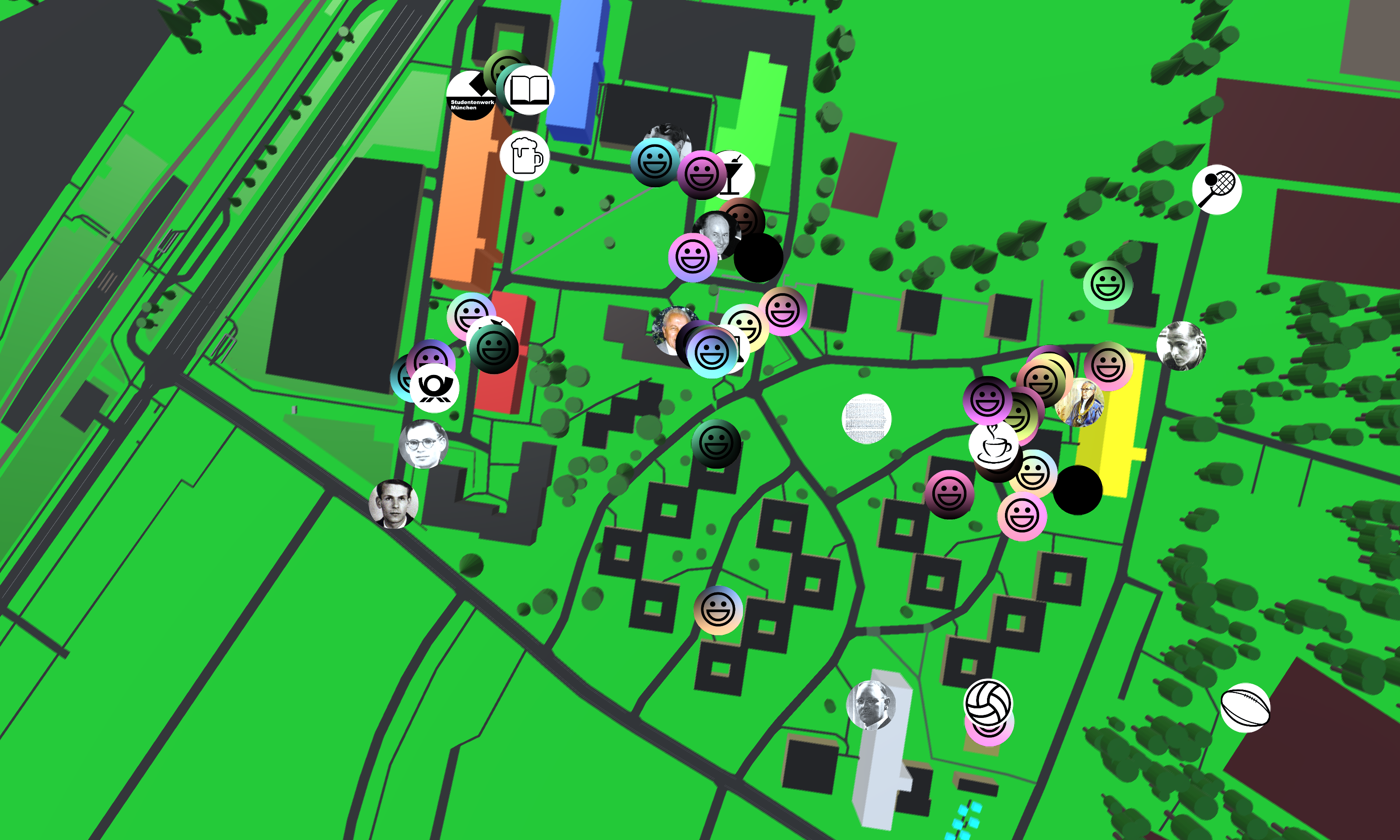 Imagine John is an exchange student. He is coming to Munich to study aborad and he will live in Studentenstadt Freimann. John is moving to the Egon-Wiberg-House, named after Egon Wiberg, former president of the Ludwig-Maximilians-Universität, who envisioned the Studentenstadt. John arrives in his new home and feels hungry. He is not sure were to go and heads to the Brotladen, a café in front of his building. While having a snack and drinking a coffee, John notices a poster about the StuStaGame, a location-based serious game that helps players to gain orientation in Studentenstadt and teaches its history. John is fascinated and installs the application that leads him onto a tour showing him the points of interest of Studentenstadt. John is moving his figure in the game world by moving around with his mobile phone in the real world. He visits the library, various bars and learns about the history of Studentenstadt, the vision of Egon-Wiberg and accomplishment of the student resistance group Die Weiße Rose. He ends his tour on the terrace of the Manhattan on top of the Hanns-Seidel-House, where he enjoys a beautiful view over Munich. 'Oh, what's that?', he wonders while seeing a smiley move on the screen. 'Another player?' He taps on it and a chat window opens. "Hello there, I'm John, are you new here?" "Yeah dude, I'm Matt. I just moved in, what are you up to? Wanna conquer some points?" John and Matt meet and embark on a journey and conquer the bars of Studentenstadt by answering questions about the Studentenstadt. They complete their tour with a beer in the Potschamperl, a pub in the cellar of the orange house. John and Matt have not only learned something about the history and the various places Studentenstadt has to offer, but they they got to know a new friend to go on adventures.