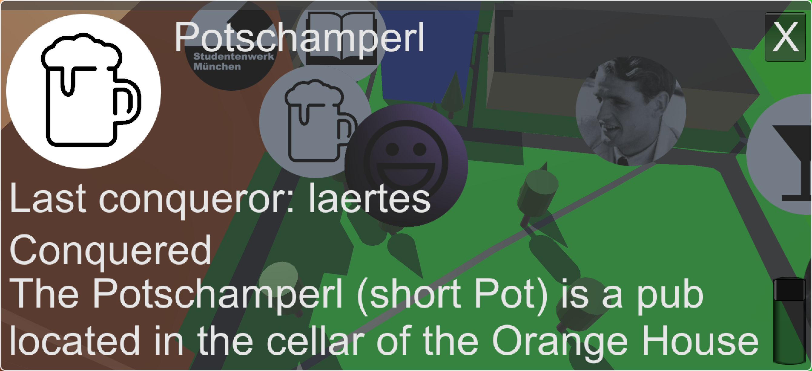 Having finished the tutorial, players are able to conquer points of interest of Studentenstadt. They can do so in any sequence, thus players explore the Studentenstadt freely. When players interact with a point of interest they see the name of the player, who conquered it last and are able to conquer it themselves by answering quiz questions. In a location-based game, quiz questions can go further than being only textual, because they can take the location into account. For example they are asked, who had the vision for the Studentenstadt and they have to walk to the Egon-Wiberg-Haus. They are asked, in which city Hans Leipelt carried on the city of the spirit of the Weiße Rose and they have to look in the direction of Hamburg.