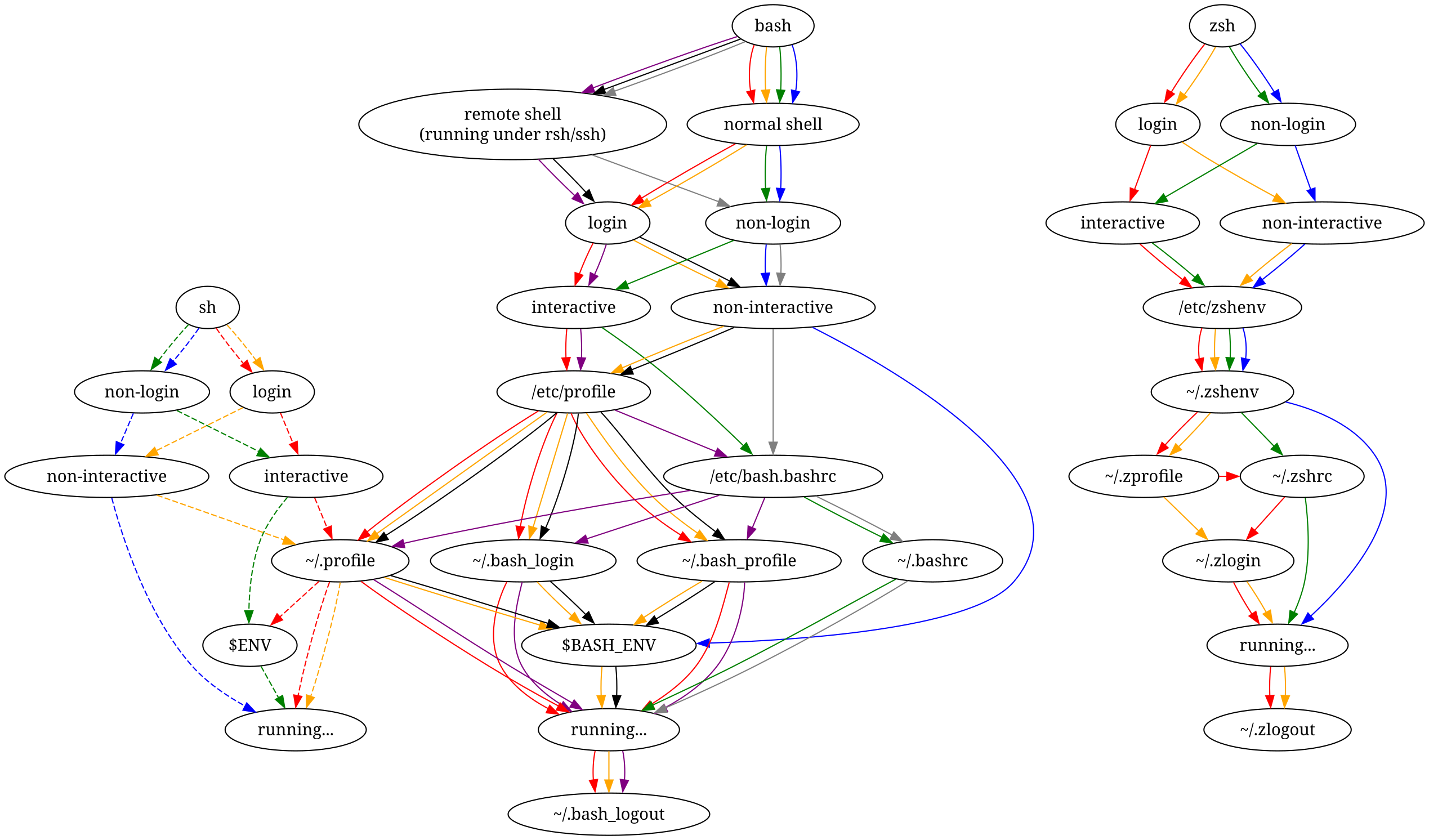 login or non-login shell, an interactive or non-interactive shell, and might be a remote shell or normal shell if SSH was involved in the execution or not. Depending on the type of shell, certain dotfiles (~/.bashrc , .bash_profile, ~/.profile ) are loaded or not.For example: