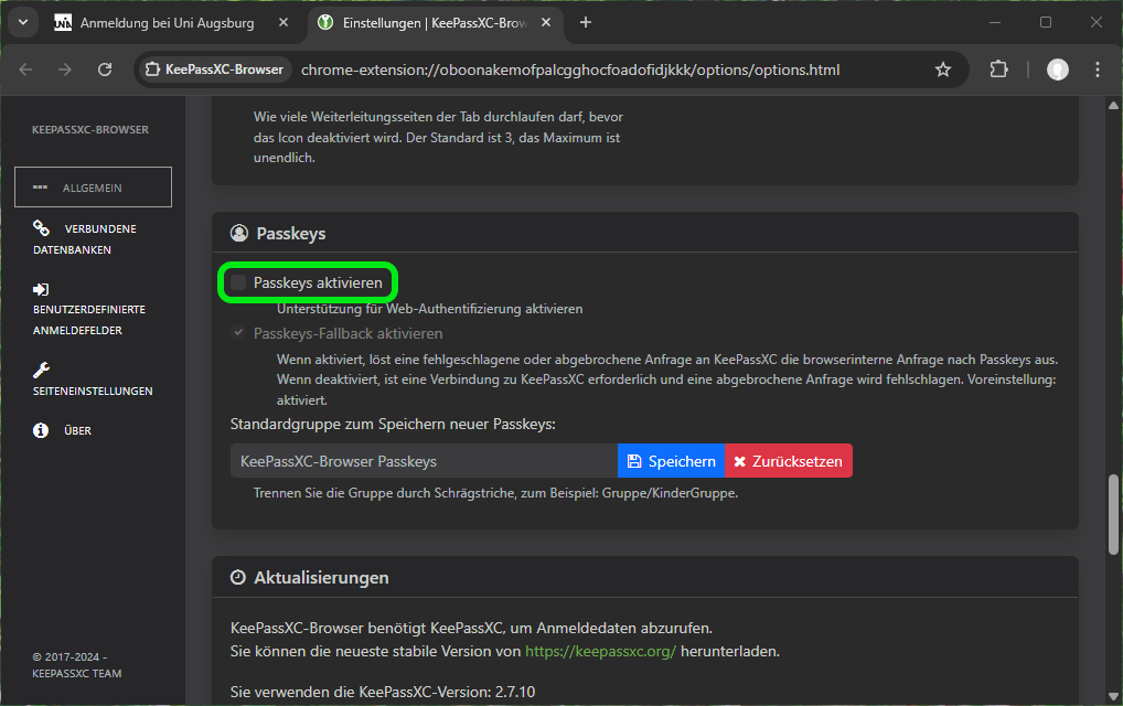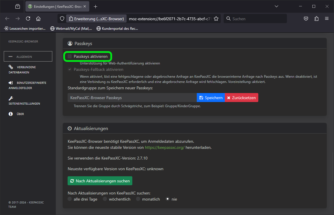 - Nach unten scrollen und Option "Passkeys aktivieren" setzen