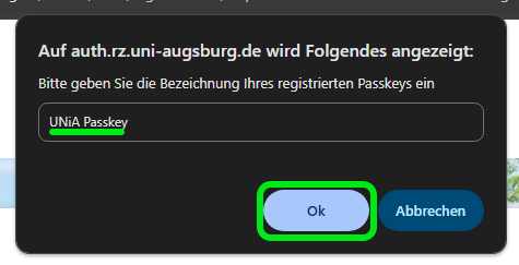 - Eine beliebige Bezeichnung für den Passkey eingeben