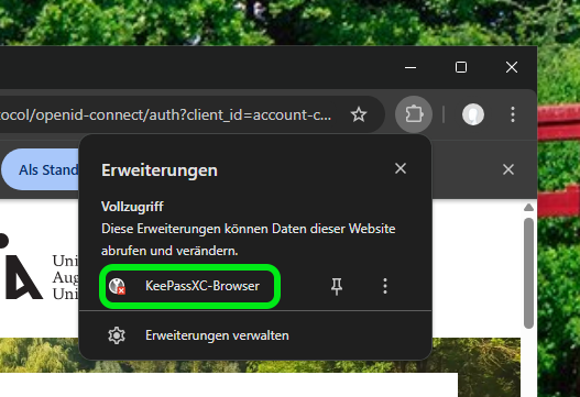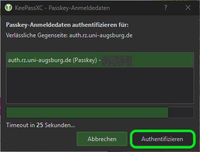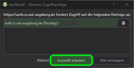→ Zum Testen kann auch einfach direkt https://auth.rz.uni-augsburg.de aufgerufen werden - Es öffnet sich ein KeepassXC-Fenster: Den Zugriff auf den Passkey über "Auswahl erlauben" zulassen
