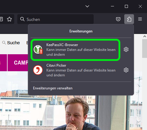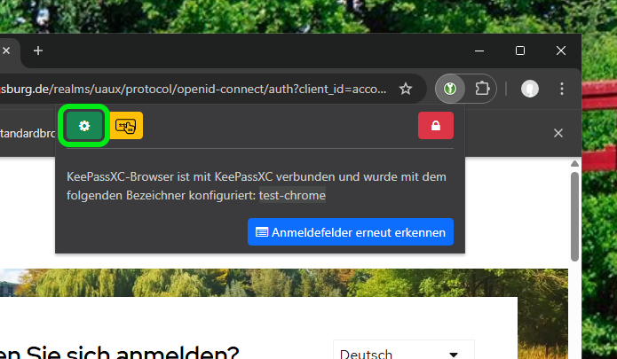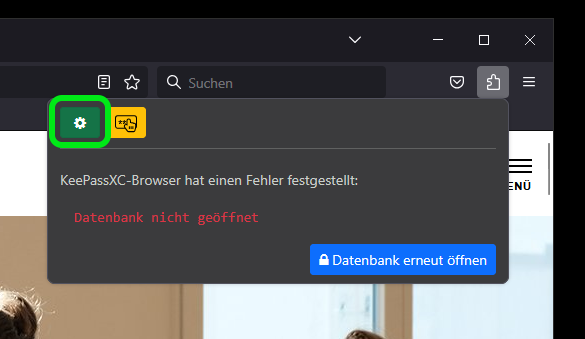 Zur Nutzung wird eine bestehende KeePassXC-Datenbank und eine Verbindung mit dem Browser-Plugin benötigt.