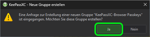 - Bei der ersten Verwendung das anlegen der Gruppe in KeePassXC mit "Ja" bestätigen
