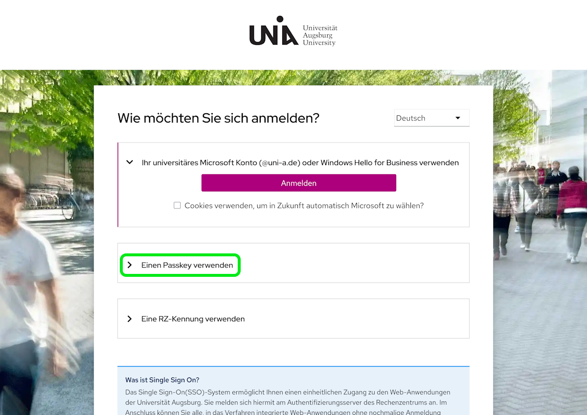 → Zum Testen kann auch einfach direkt https://auth.rz.uni-augsburg.de aufgerufen werden - Den Zugriff auf den Passkey über "Auswahl erlauben" zulassen