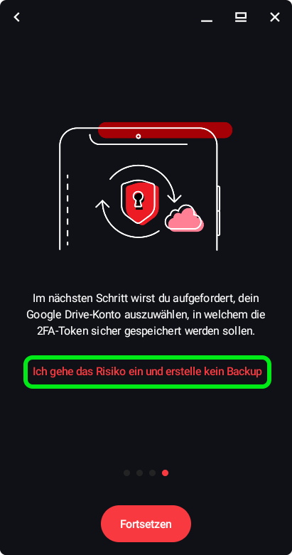 → Auf Android bis zur letzten Seite blättern, hier das optionale Cloud-Backup mit "Ich gehe das Risiko ein und erstelle kein Backup" überspringen - "Neuen Dienst koppeln"