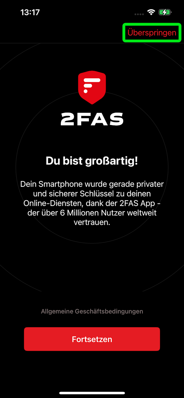 → Auf Apple iOS/iPadOS kann der Dialog direkt über die Schaltfläche "Überspringen" umgangen werden