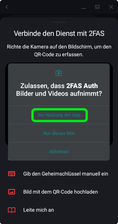 - Mit der Kamera den im Browser angezeigten QR-Code einlesen