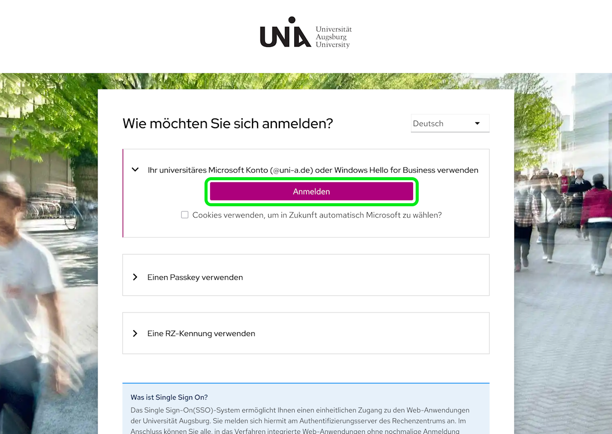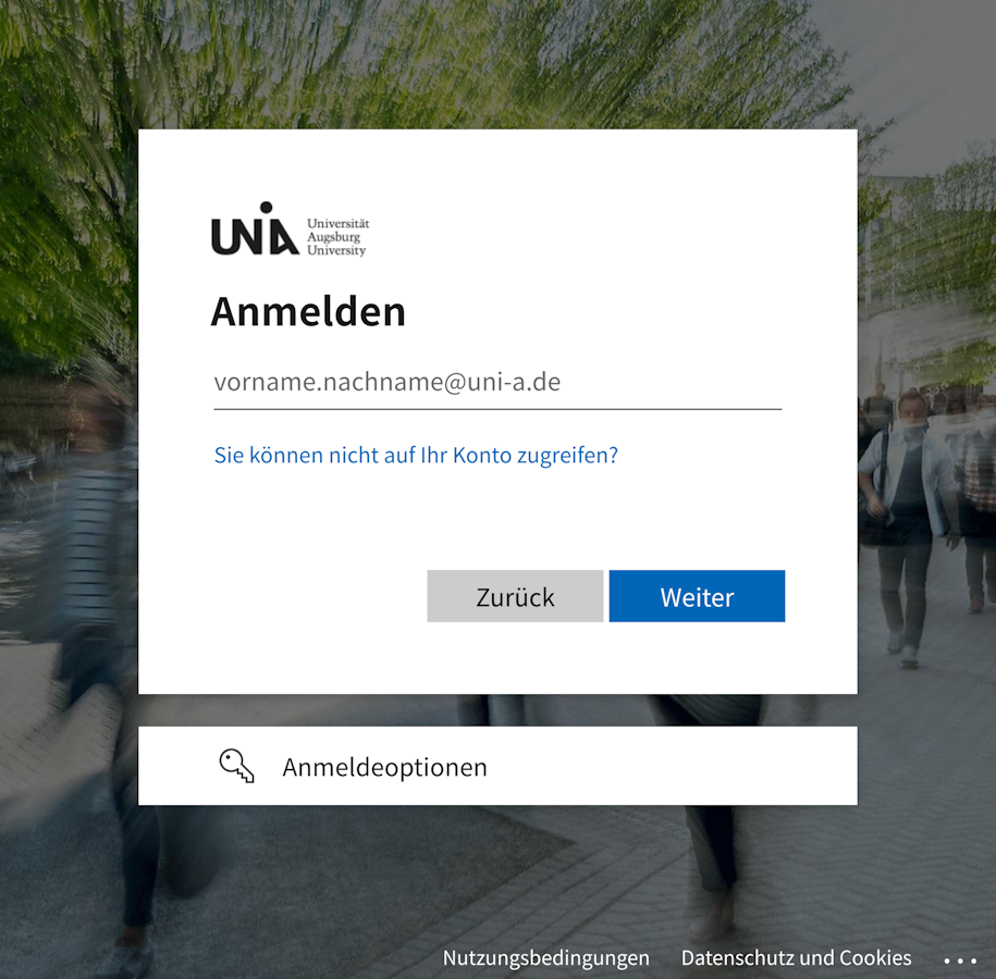 - Die Anmeldung über den universitärem Microsoft Konto (@uni-a.de) wählen
