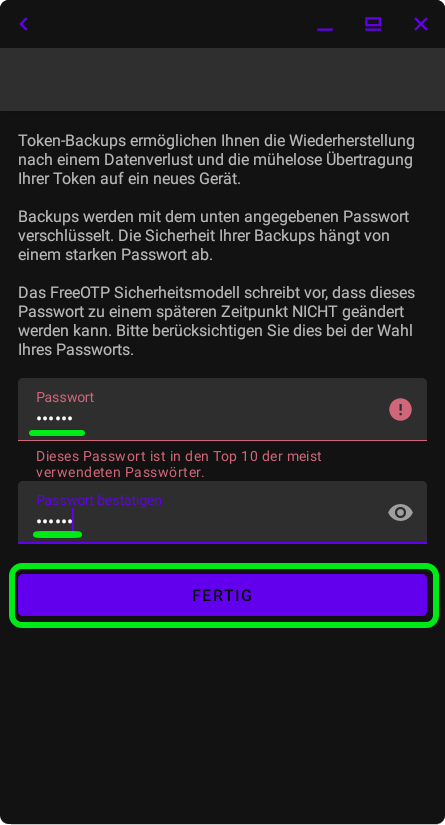- Für spätere Backups muss ein sicheres (Verschlüsselungs-)Passwort festgelegt werden, dieses wird später ggf. bei der Wiederherstellung benötigt