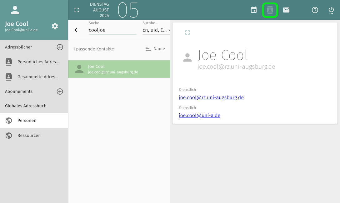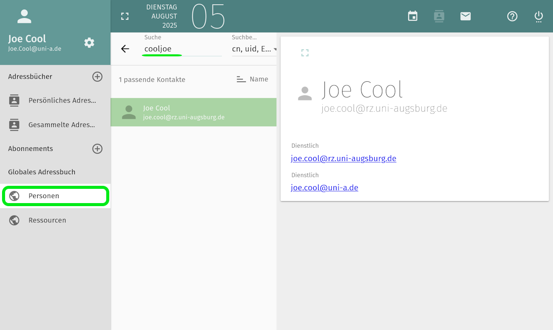 - Aus der Seitenleiste das "Personen"-Adressbuch im Abschnitt "Globales Adressbuch" auswählen