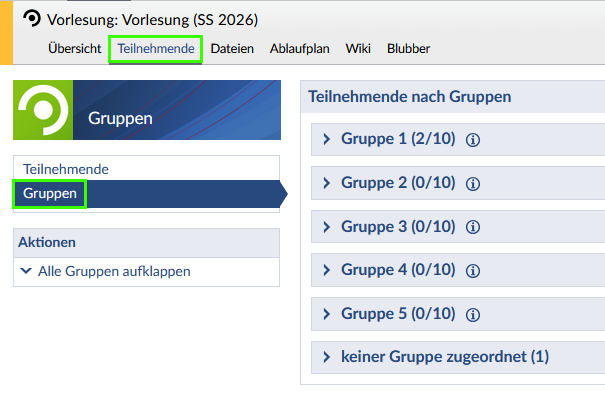 - Klicken Sie in der gewünschten Lehrveranstaltung auf den Reiter „Teilnehmende“ und wählen Sie links den Menüpunkt „Gruppen“