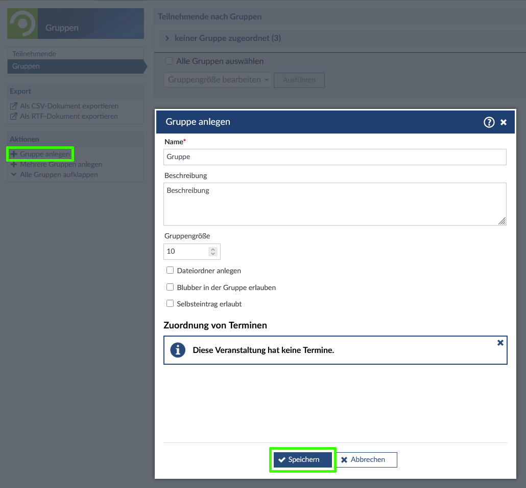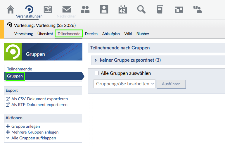 (Hier finden Sie nun die Übersichtsseite der Gruppen Ihrer Lehrveranstaltung. Eine Liste aller Gruppen kann mit den Funktionen im linken Export-Menü generiert werden.) Wählen Sie die Aktion „Gruppe anlegen“ aus, um eine einzelne Gruppe anzulegen und setzen Sie die gewünschten Parameter, klicken Sie abschließend auf den Button „Speichern“, um die Gruppe zu erstellen