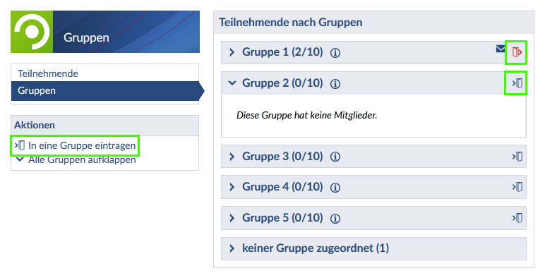 Sie können sich über das Türsymbol oder die Aktion „In eine Gruppe eintragen“ einer oder mehrerer Gruppen zuordnen, sofern die Selbsteintragung aktiviert ist und die Gruppe verlassen, sofern die Option zur selbständigen Austragung aktiviert ist