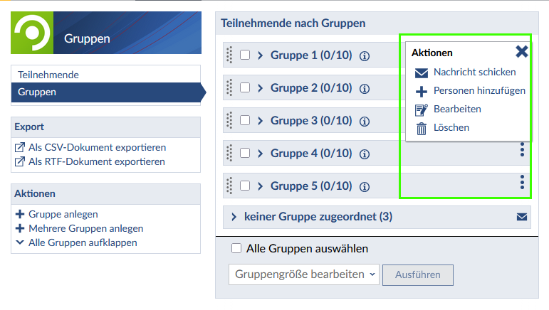(Hier können Sie entweder über die Angabe eines Namenspräfixes bzw. die Zuordnung zu vorhandenen Veranstaltungsdaten (Themen, Termine, Lehrende) mehrere Gruppen gleichzeitig anlegen. Beachten Sie bitte bei der Verwendung der Anlegeoption „pro regelmäßiger Zeit/Einzeltermin“, dass bei regelmäßigen Terminen nur eine Gruppe für den gesamten regelmäßigen Zeitslot angelegt wird und nicht für jede Wiederholung des Termins eine Gruppe erstellt wird. Auch hier können Sie die Gruppengröße, Dateiordner und Selbsteintragung konfigurieren. Die getroffenen Einstellungen gelten für alle anzulegenden Gruppen.) Über das 3-Punkte Menü können Sie die einzelnen Gruppen bearbeiten, löschen, ihnen Personen hinzufügen und Nachrichten an alle Gruppenmitglieder schicken, um mehrere Gruppen gleichzeitig zu bearbeiten, markieren Sie die entsprechenden Gruppen, wählen Sie die gewünschte Option aus und klicken Sie auf „Ausführen“