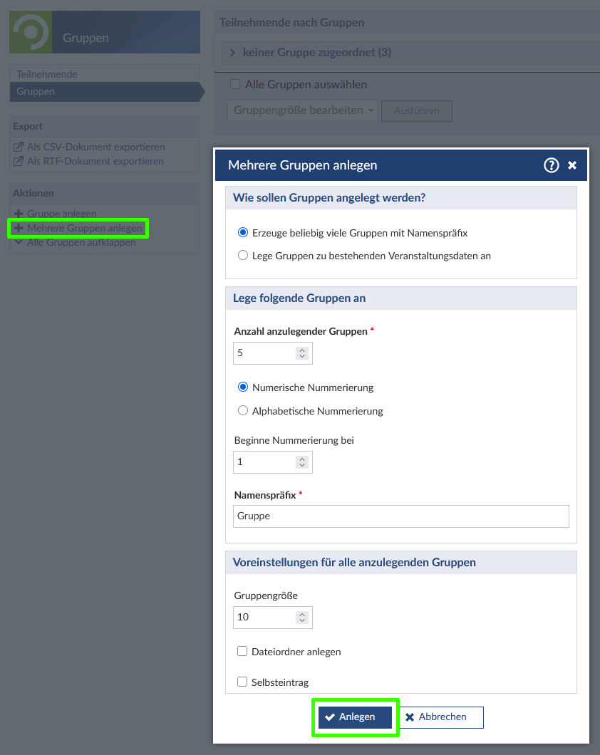 - Wählen Sie die Aktion „Mehrere Gruppen anlegen“ aus, um mehrere Gruppen gleichzeitig anzulegen und setzen Sie die gewünschten Parameter, klicken Sie abschließend auf den Button „Anlegen“, um die Gruppen zu erstellen