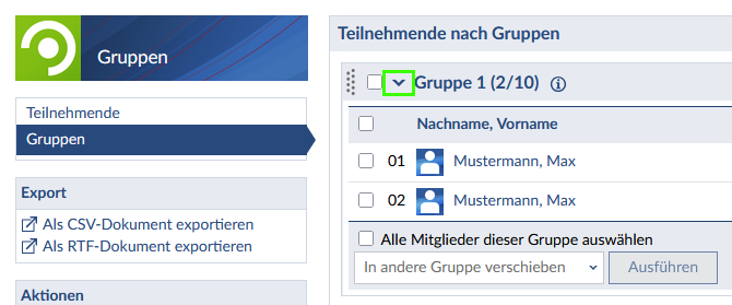 - Klicken Sie auf das Pfeilsymbol neben dem Gruppennamen, um sich die Mitglieder einer Gruppe anzeigen zu lassen