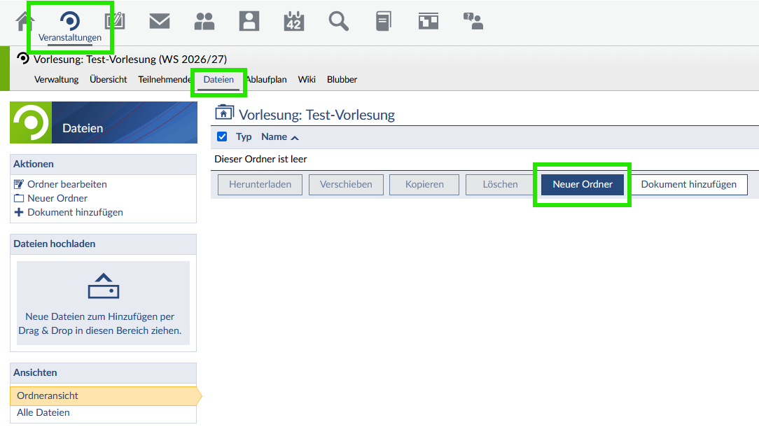 Sie können nun Dateien in diesen Ordner hochladen. Für Studierende sind diese nur im von Ihnen angegebenen Zeitraum sichtbar