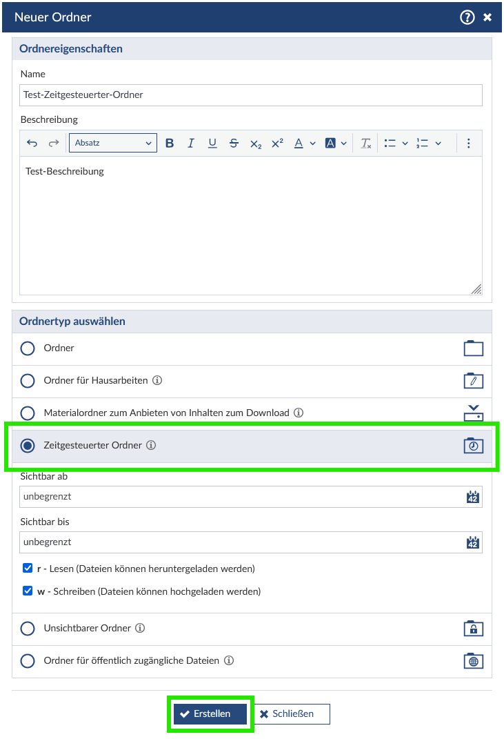Vergeben Sie einen geeigneten Ordnernamen und wählen Sie den Ordnertyp „Zeitgesteuerter Ordner“ aus. Sie haben nun die Möglichkeit einen Start- und Endzeitpunkt für die Sichtbarkeit anzugeben, sowie die Ordnerberechtigungen für Studierende anzupassen. Klicken Sie nach der Konfiguration auf den Button „Erstellen“