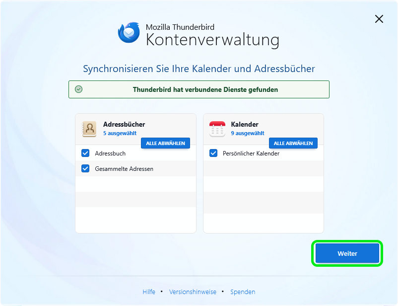 - Wurden Kalender/Adressbücher gefunden, können diese jetzt Ab bzw. Ausgewählt werden