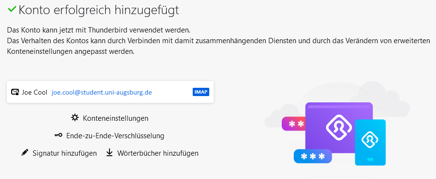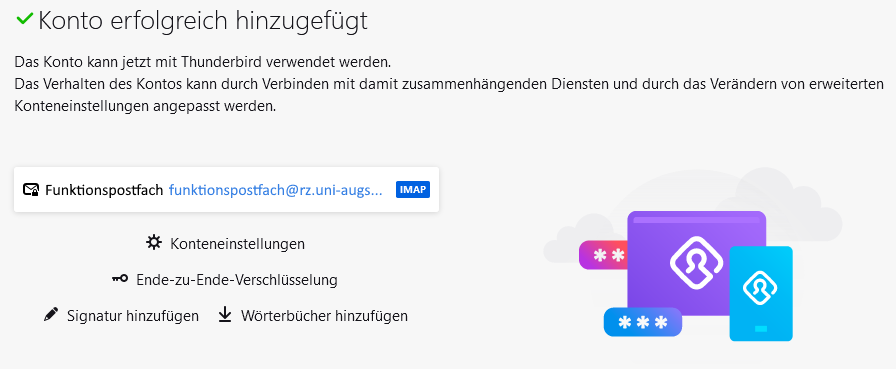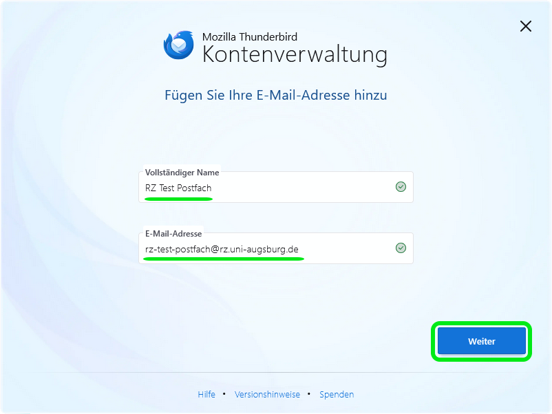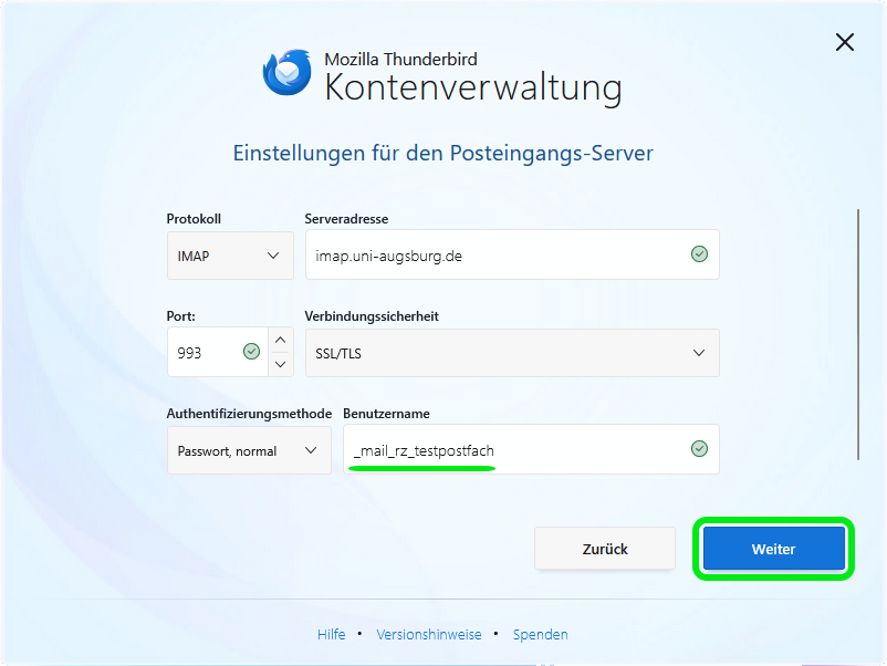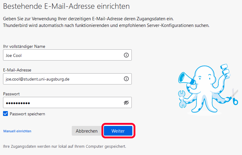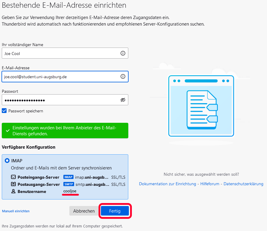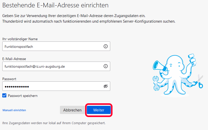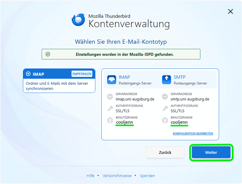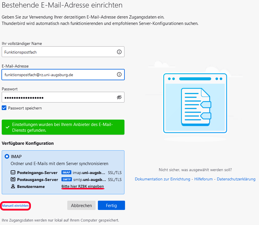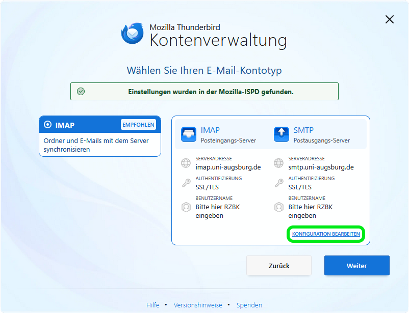 Für Mozilla Thunderbird steht für die Universität ein Konfigurationsserver bereit, dieser übermittelt automatisch alle notwendigen Parameter zur Einrichtung sodass Thunderbird. Allerdings wird dazu eine Verbindung mit dem Universitätsnetz benötigt z.B. via eduroam, im Büro am LAN oder von Zuhause/Außerhalb über unseren VPN