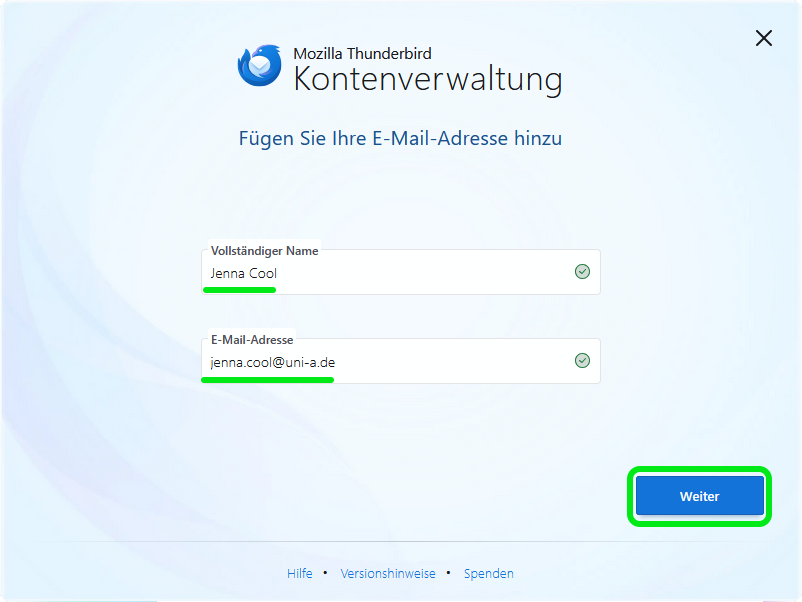 Im Assistenten den Namen, die universitäre Mailadresse und das Passwort der RZ-Benutzerkennung eingeben