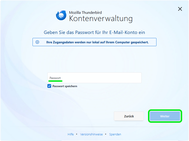 - Im Assistenten den Anzeigenamen, die Funktionsmailadresse und das Passwort des Funktionspostfachs eingeben