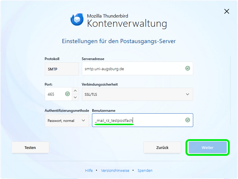 - Im Feld "Benutzername" die Funktionskennung für den Postausgangs-Server eintragen (muss mit "_mail" beginnen)