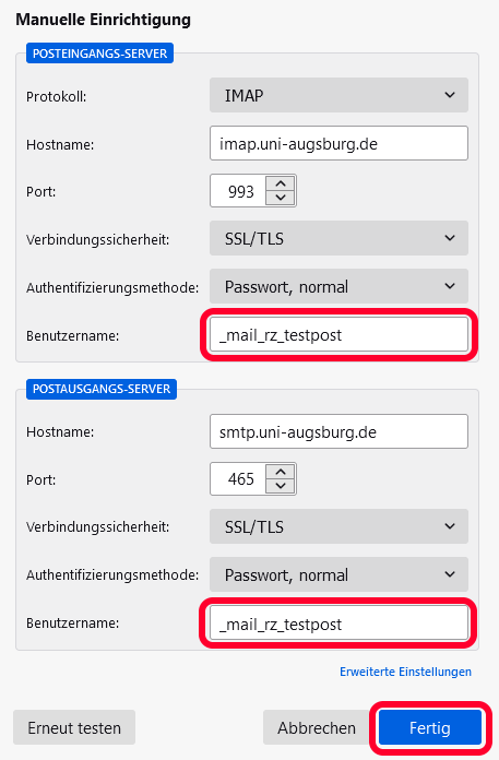→ Im Feld "Benutzername" sollte die eigene RZ-Kennung stehen - "Fertig"