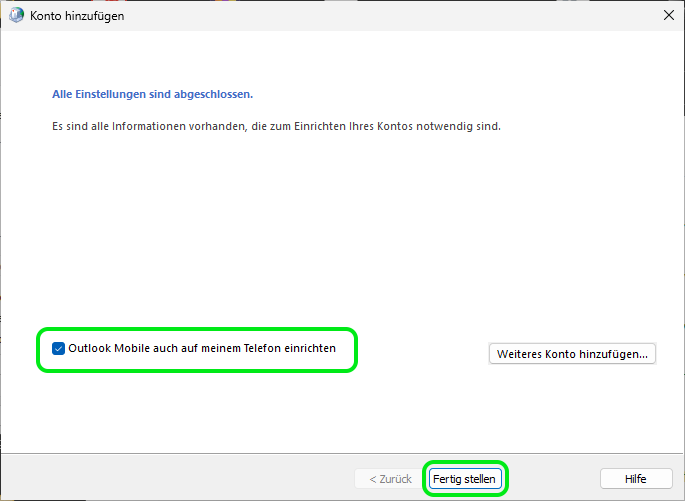 - Die Optionsbox "Outlook Mobile auch auf meinem Telefon einrichten" deaktivieren
